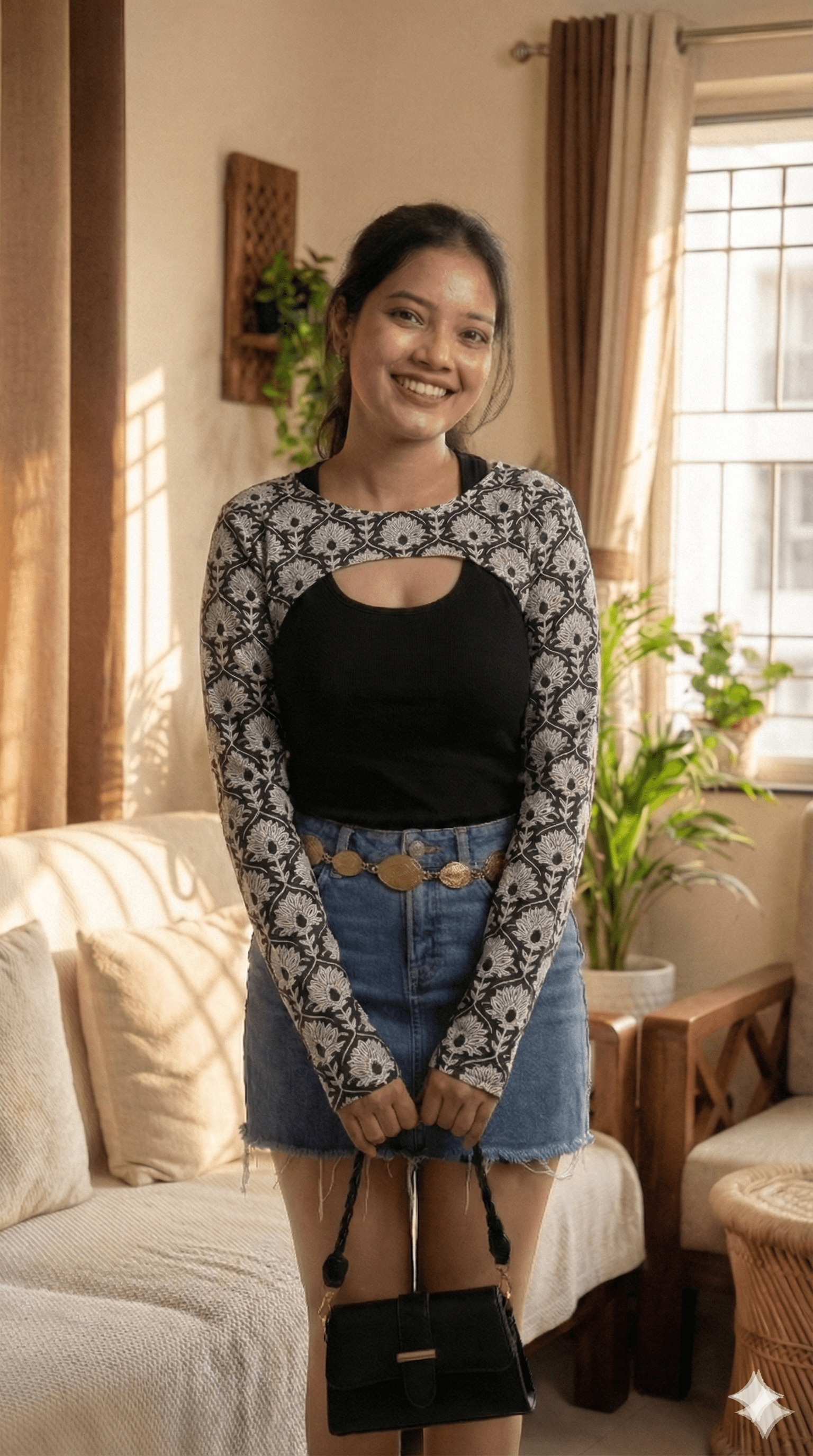 Handcrafted in pure handblock printed cotton, Laila features timeless black & ivory floral motifs inspired by traditional Indian artistry. Designed to transform effortlessly, this kurti can be styled in multiple ways — as a corset-back top, a full-sleeve kurti, layered over a shirt, or worn open as a fusion jacket-style piece.