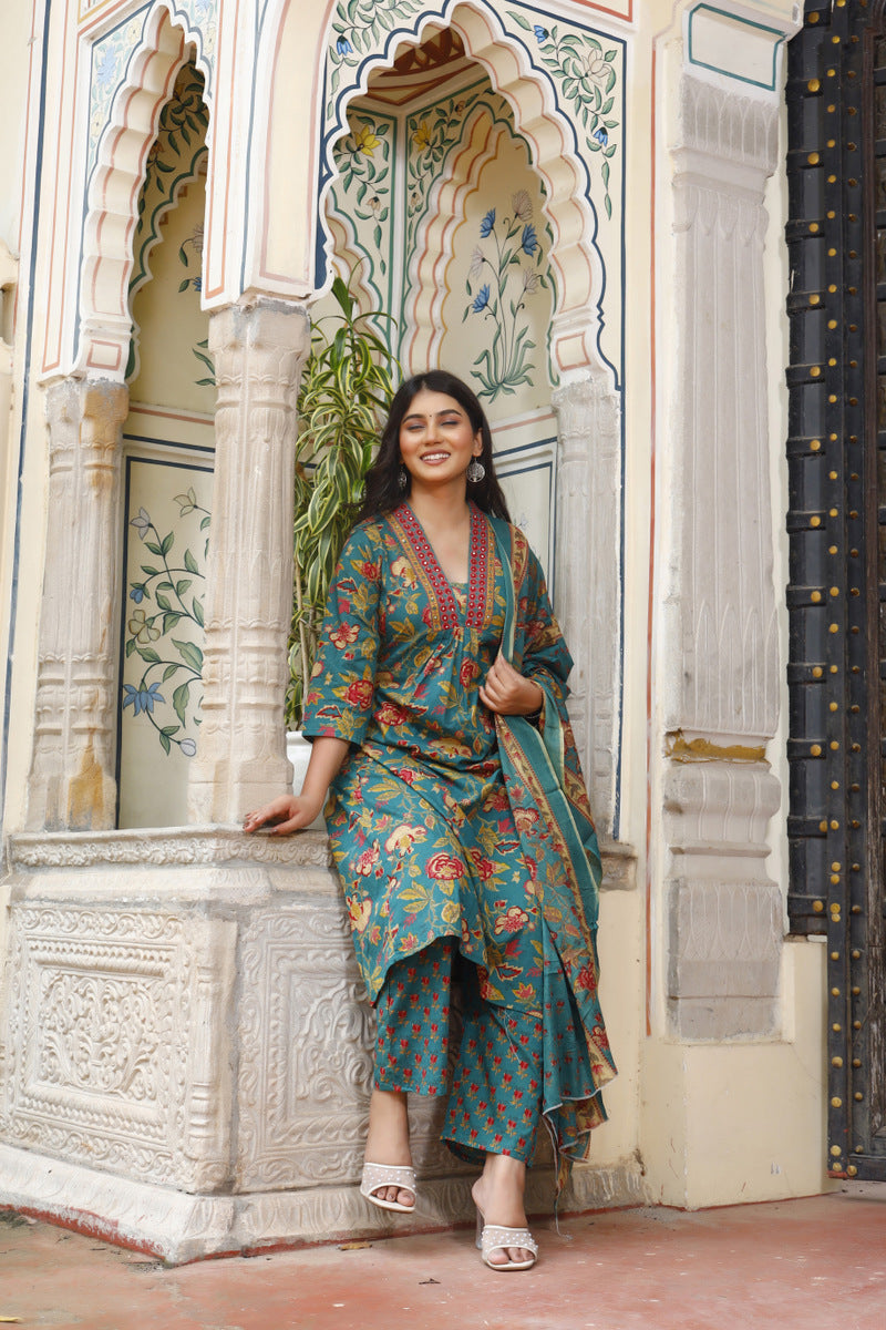 Festive Wear Jaipuri Cotton Suit Set for Women – Kurta, Pant & Dupatta- House Of The Handblock