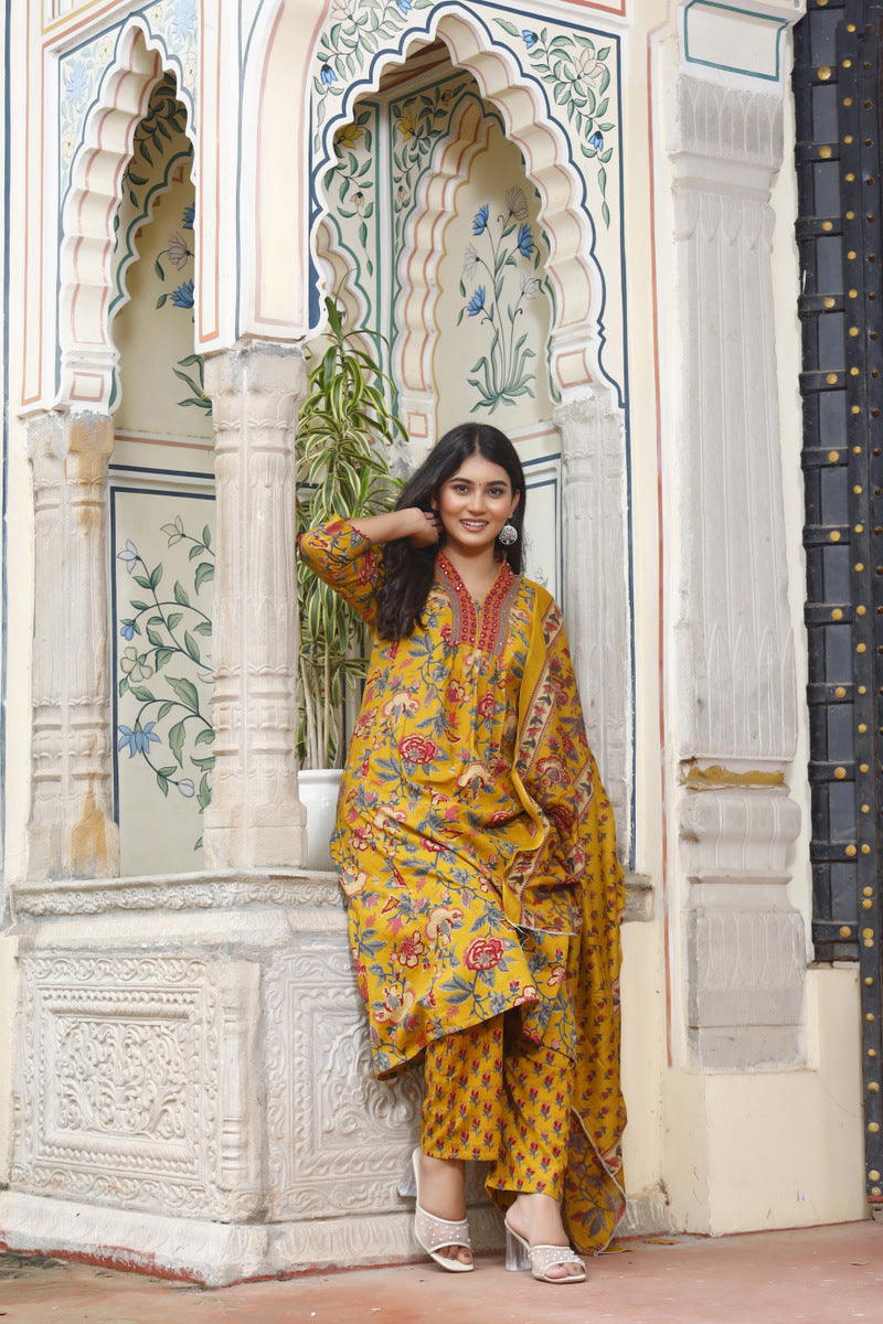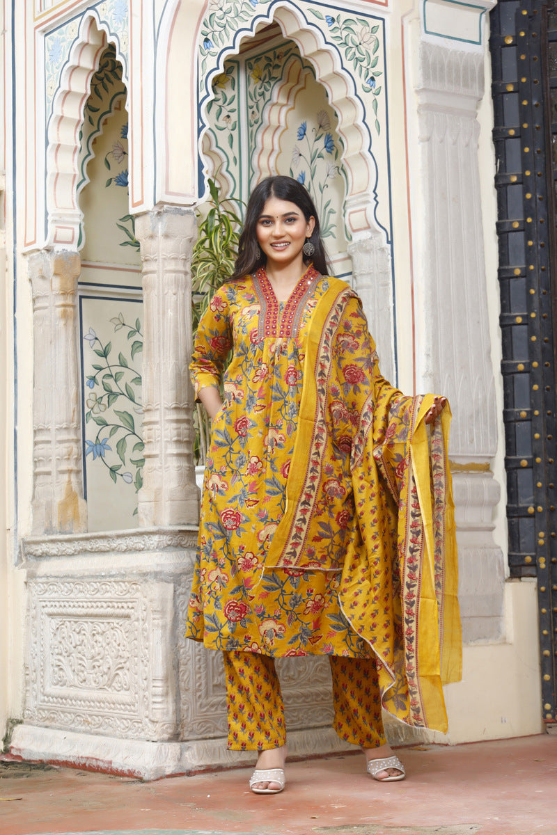 Festive Wear Jaipuri Cotton Suit Set for Women – Kurta, Pant & Dupatta- House Of The Handblock