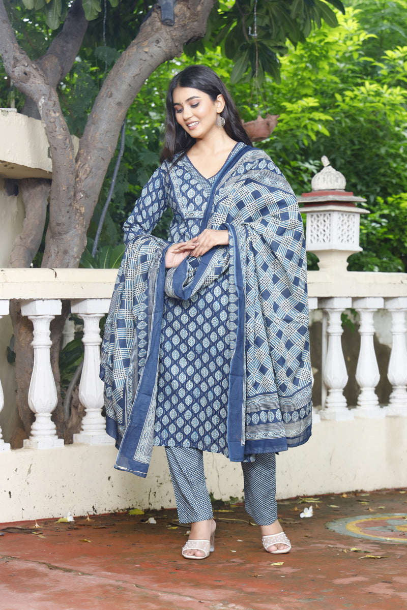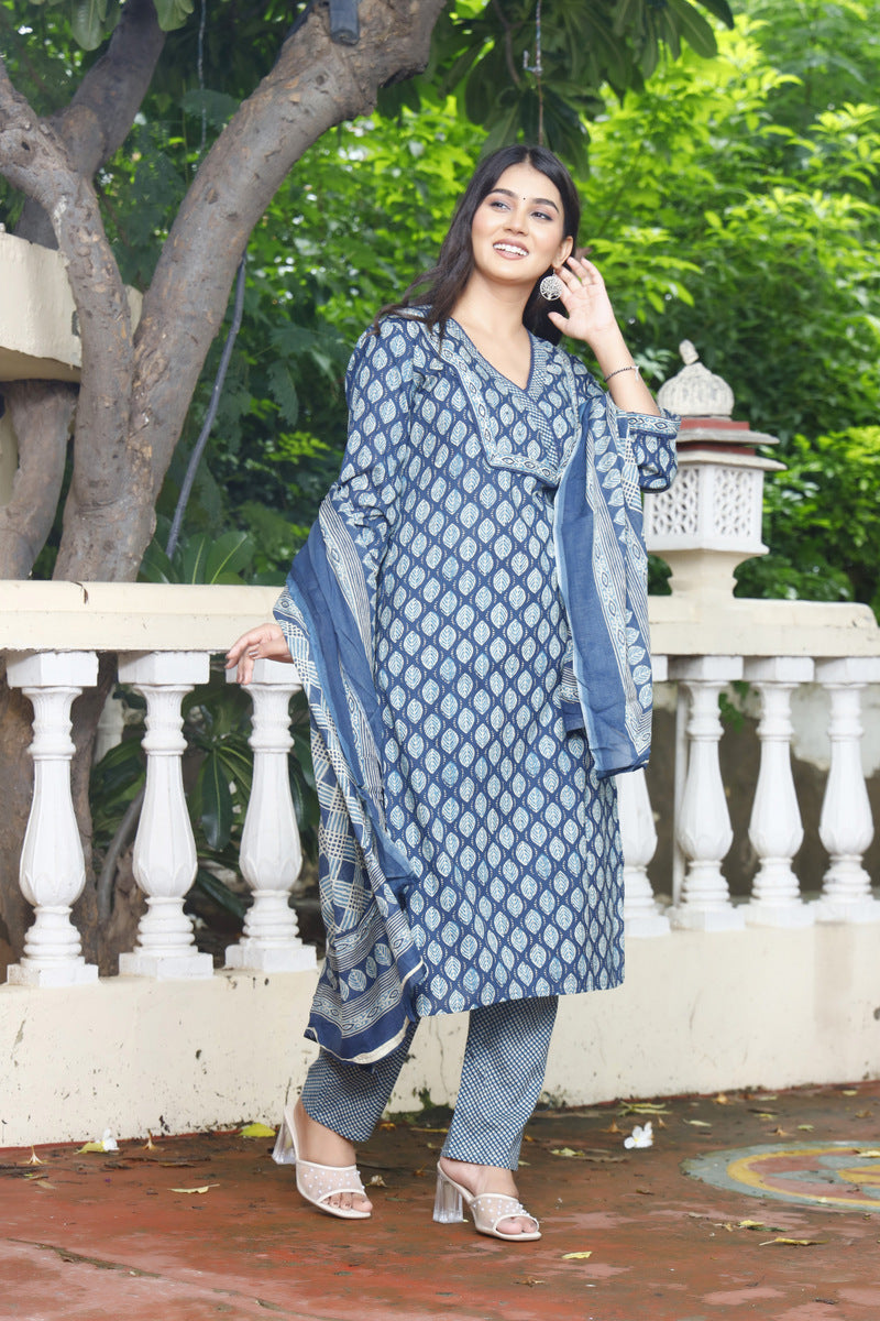 Festive Wear Jaipuri Cotton Suit Set for Women – Kurta, Pant & Dupatta- House Of The Handblock