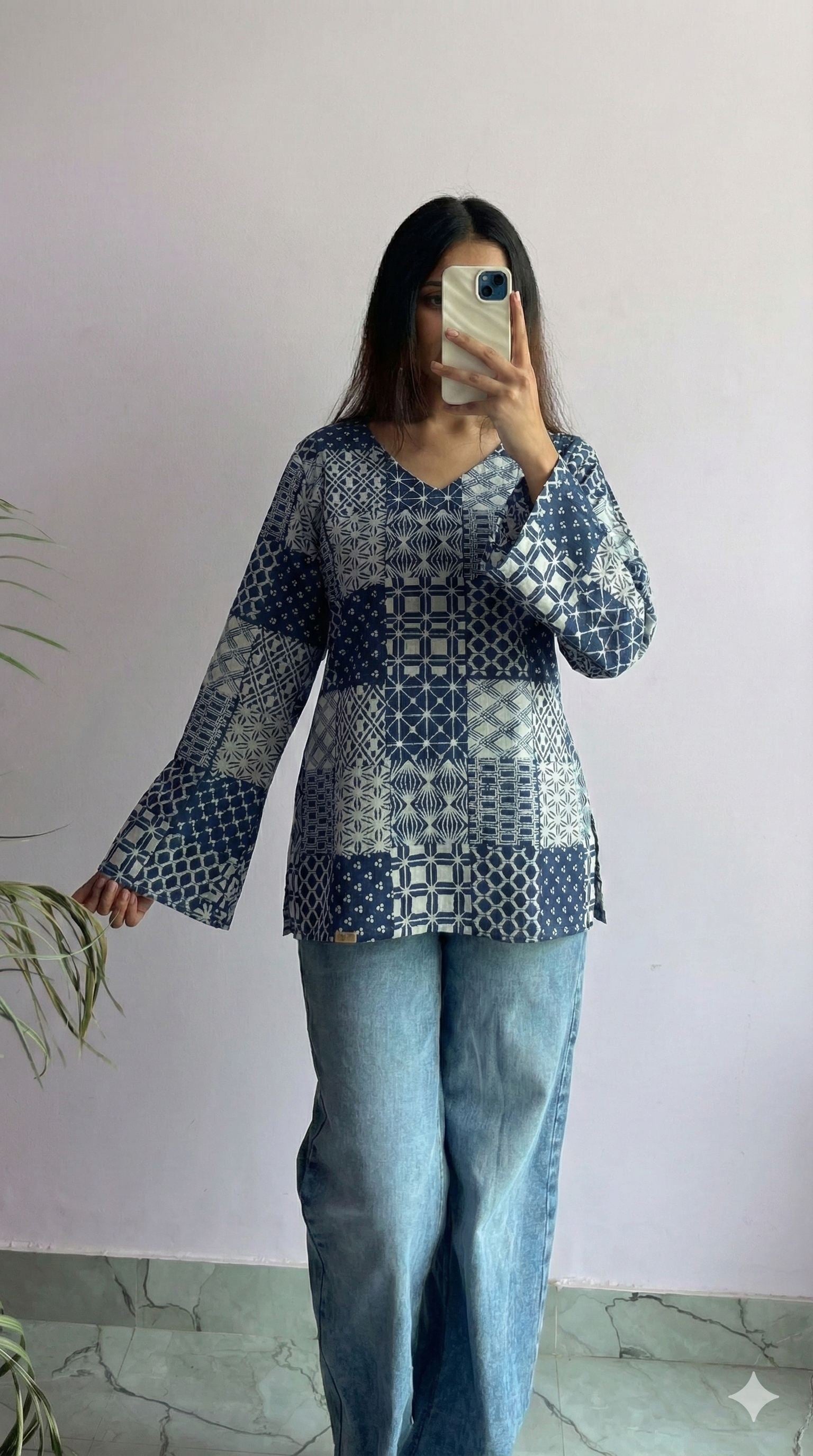 Designed with a flattering V-neckline and stylish bell sleeves, it’s the perfect blend of modern chic and timeless handblock charm. Whether you pair it with jeans, palazzos, skirts, or pants, this top effortlessly elevates your look — from casual outings to festive gatherings.