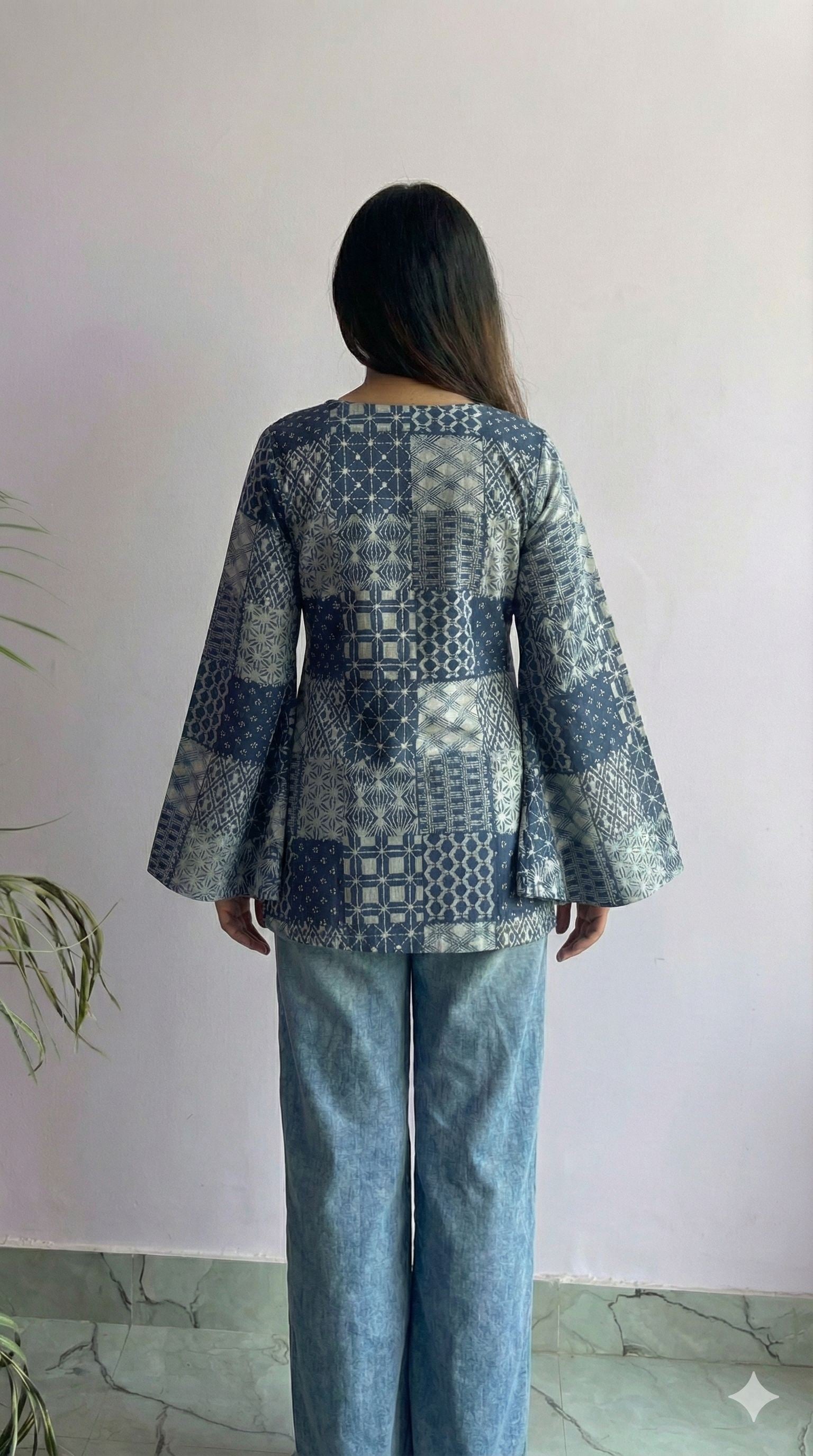 Handcrafted Handblock Cotton Bell Sleeve V-Neck Top – Stylish Short Top for Daily Wear