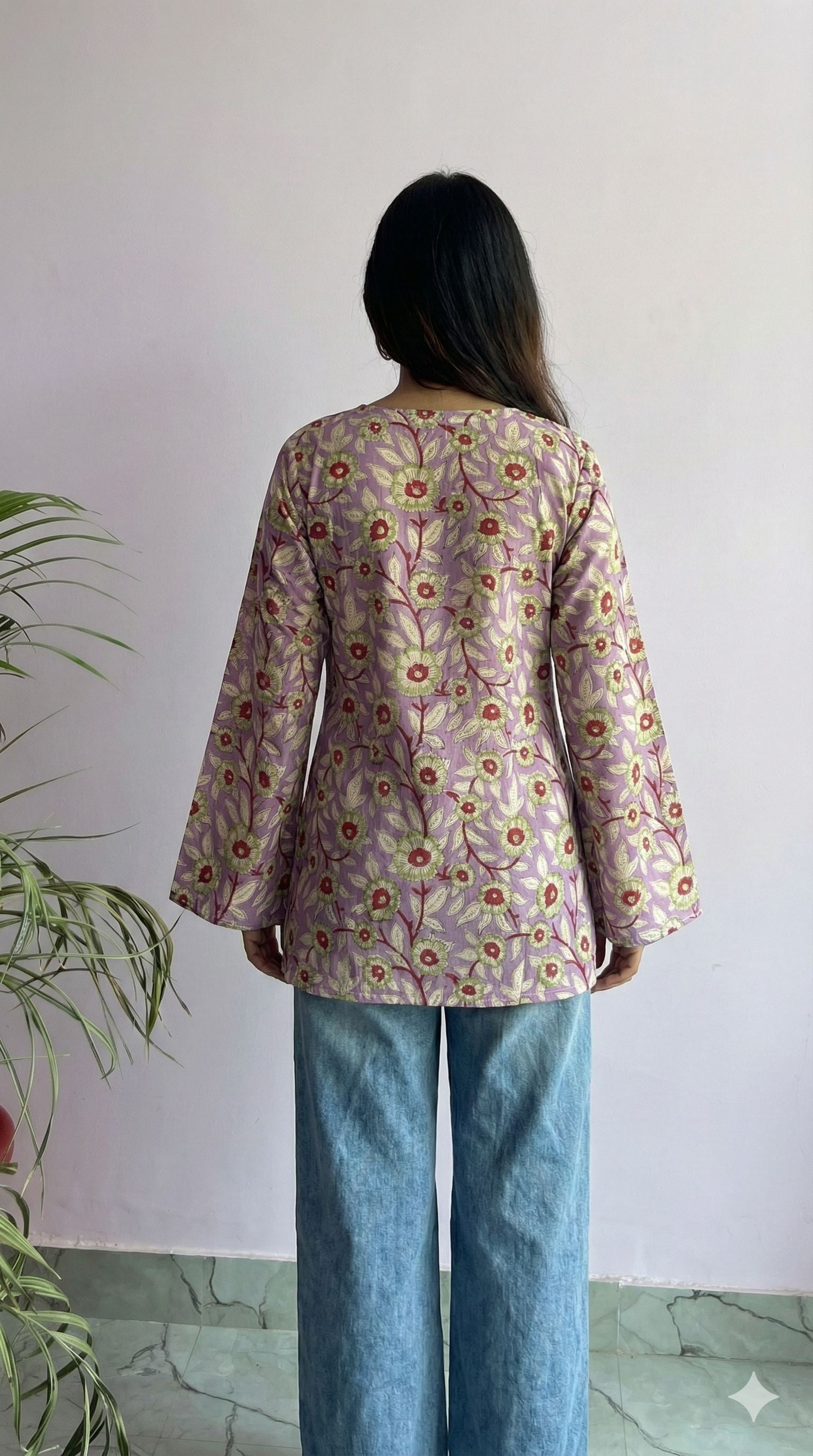 Designed with a flattering V-neckline and stylish bell sleeves, it’s the perfect blend of modern chic and timeless handblock charm. Whether you pair it with jeans, palazzos, skirts, or pants, this top effortlessly elevates your look — from casual outings to festive gatherings.