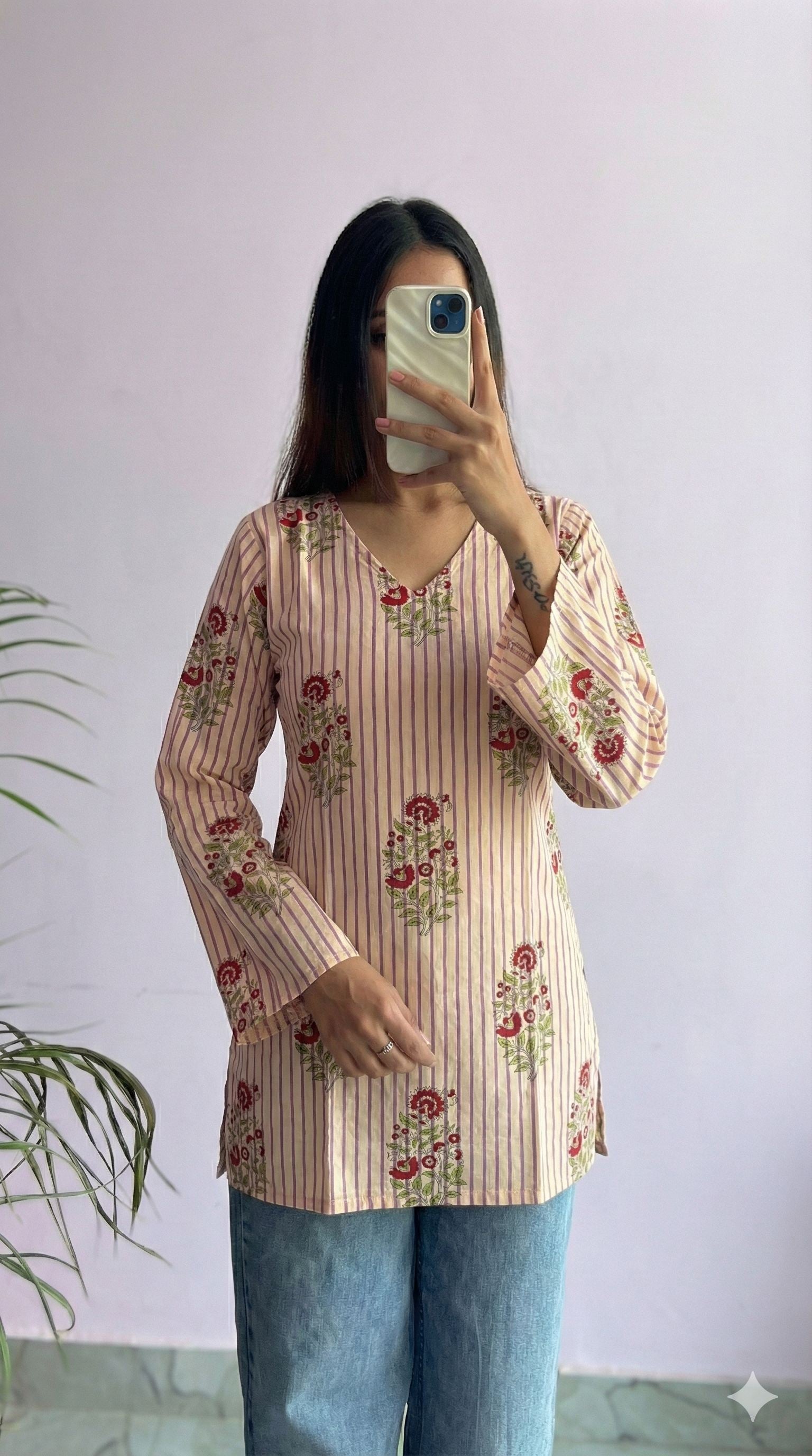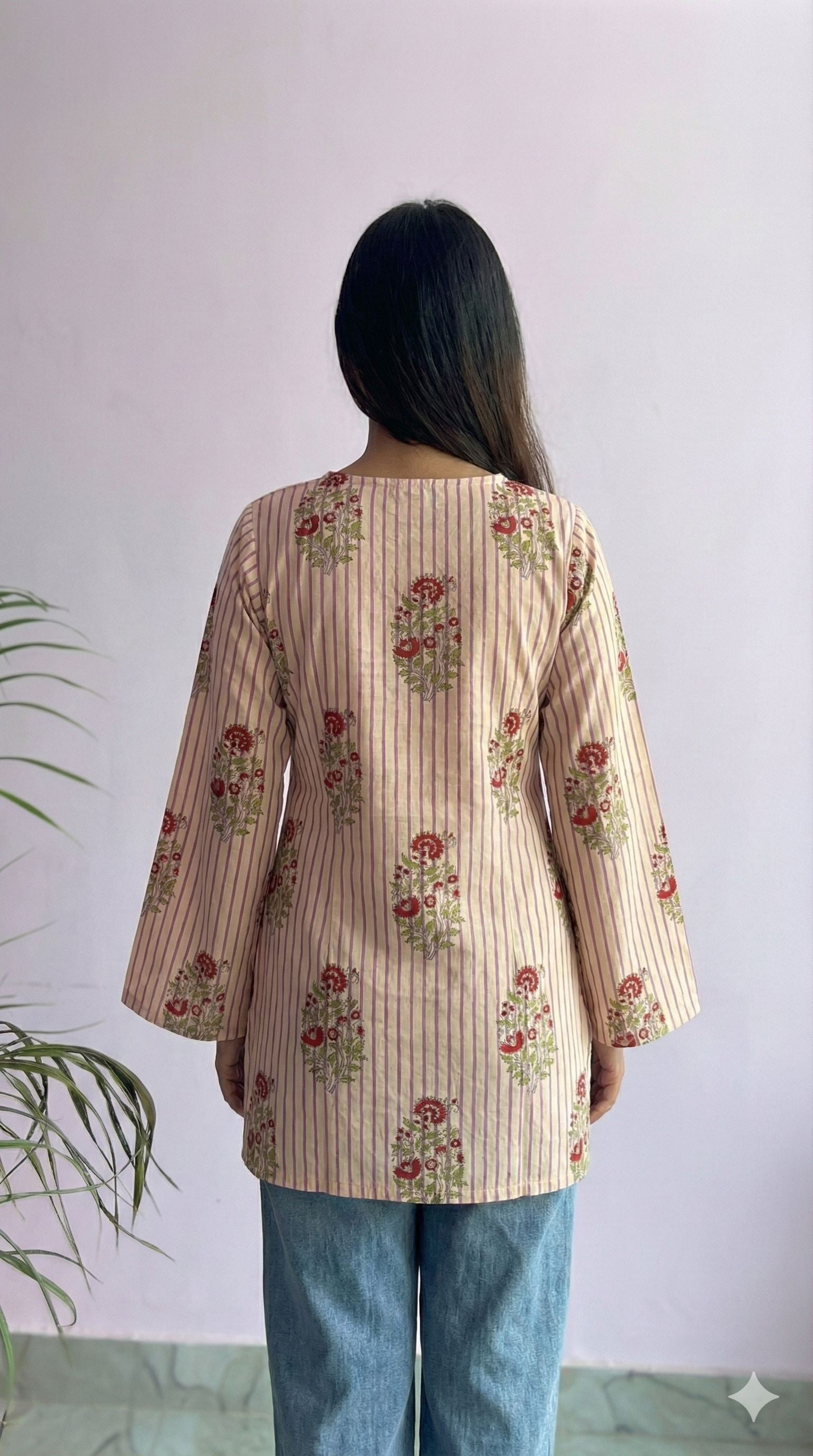 Designed with a flattering V-neckline and stylish bell sleeves, it’s the perfect blend of modern chic and timeless handblock charm. Whether you pair it with jeans, palazzos, skirts, or pants, this top effortlessly elevates your look — from casual outings to festive gatherings.