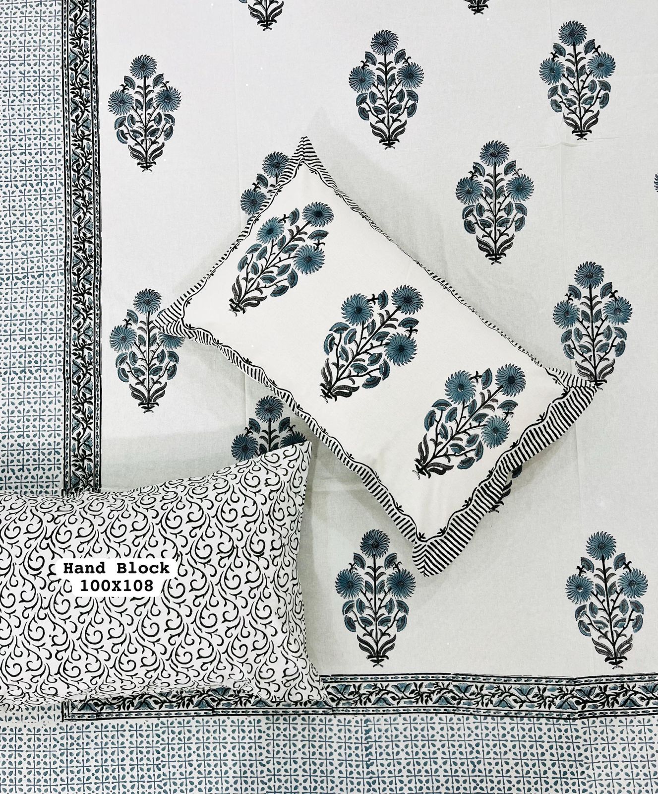 Pure Handblock King Size Cotton Bedsheet Set with 2 Reversible Zipped Pillow Covers – Premium South Cotton
