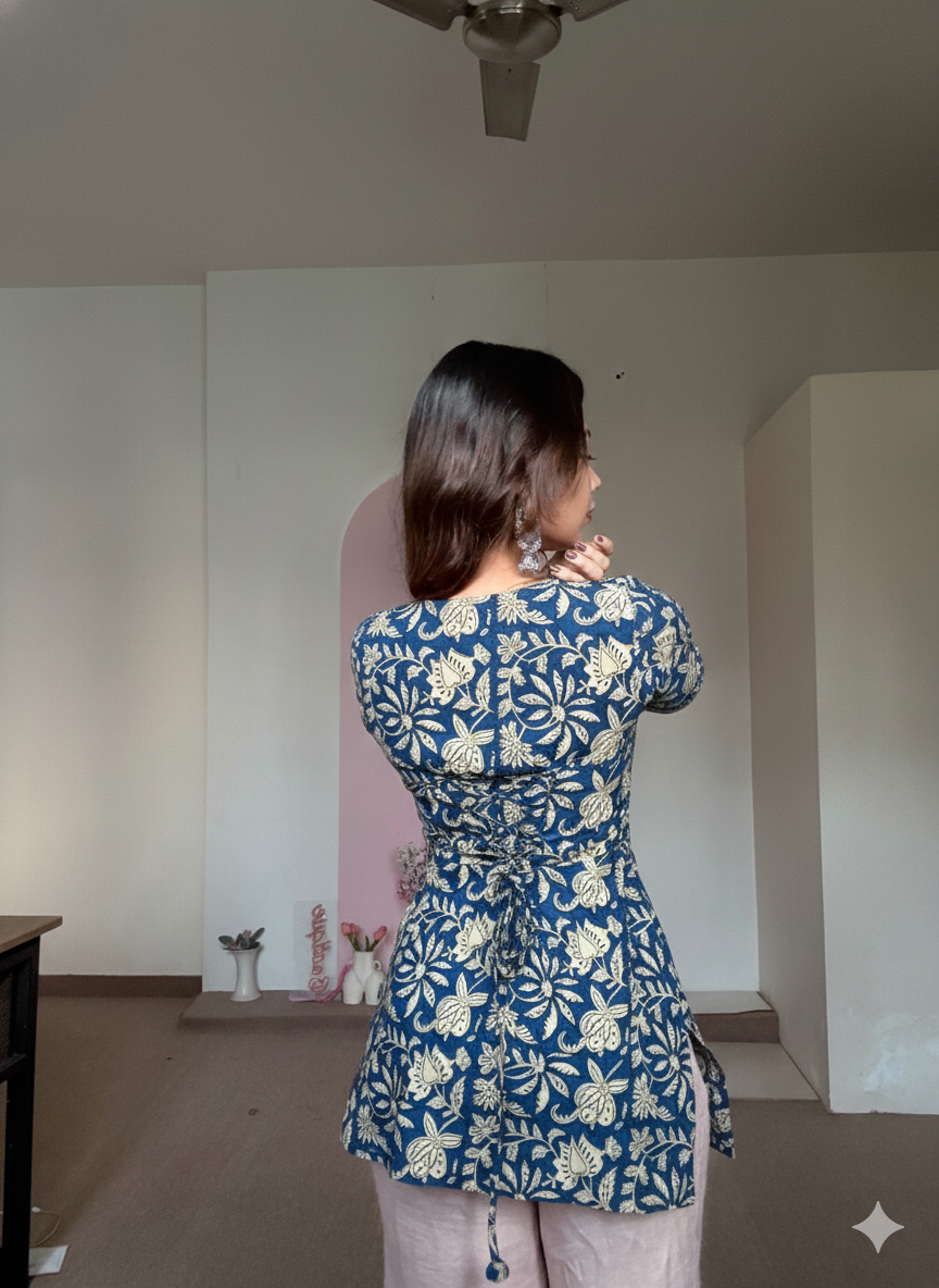 Each corset is uniquely handmade, so the print placement or shades may vary slightly from the pictures — that’s the beauty of authentic handblock art.