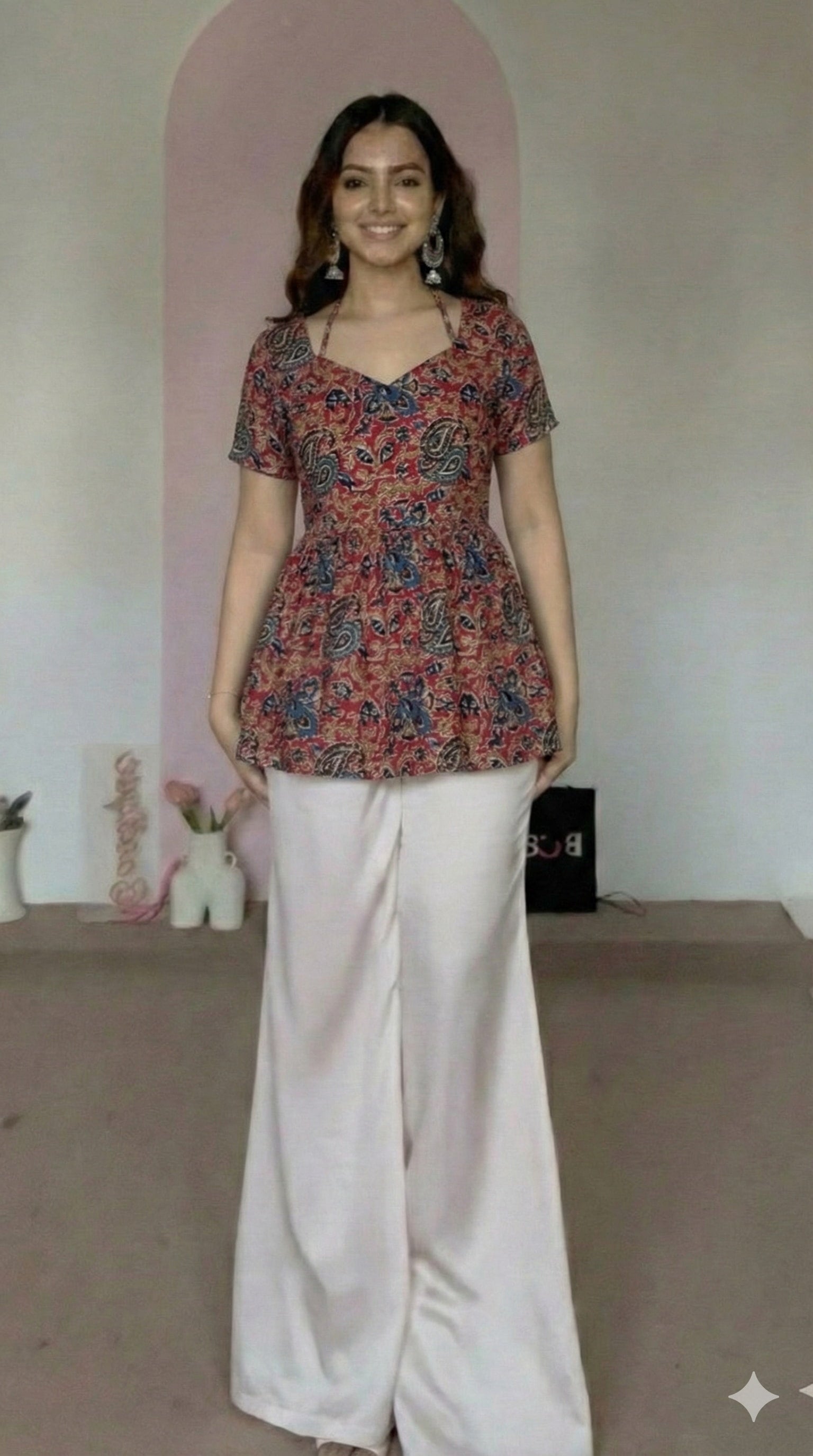 This trending style features adjustable back lace ties and a neck tie string, designed to flatter every body type from XS to 4XL. Perfect for pairing with skirts, pants, or sarees for a fusion ethnic look.