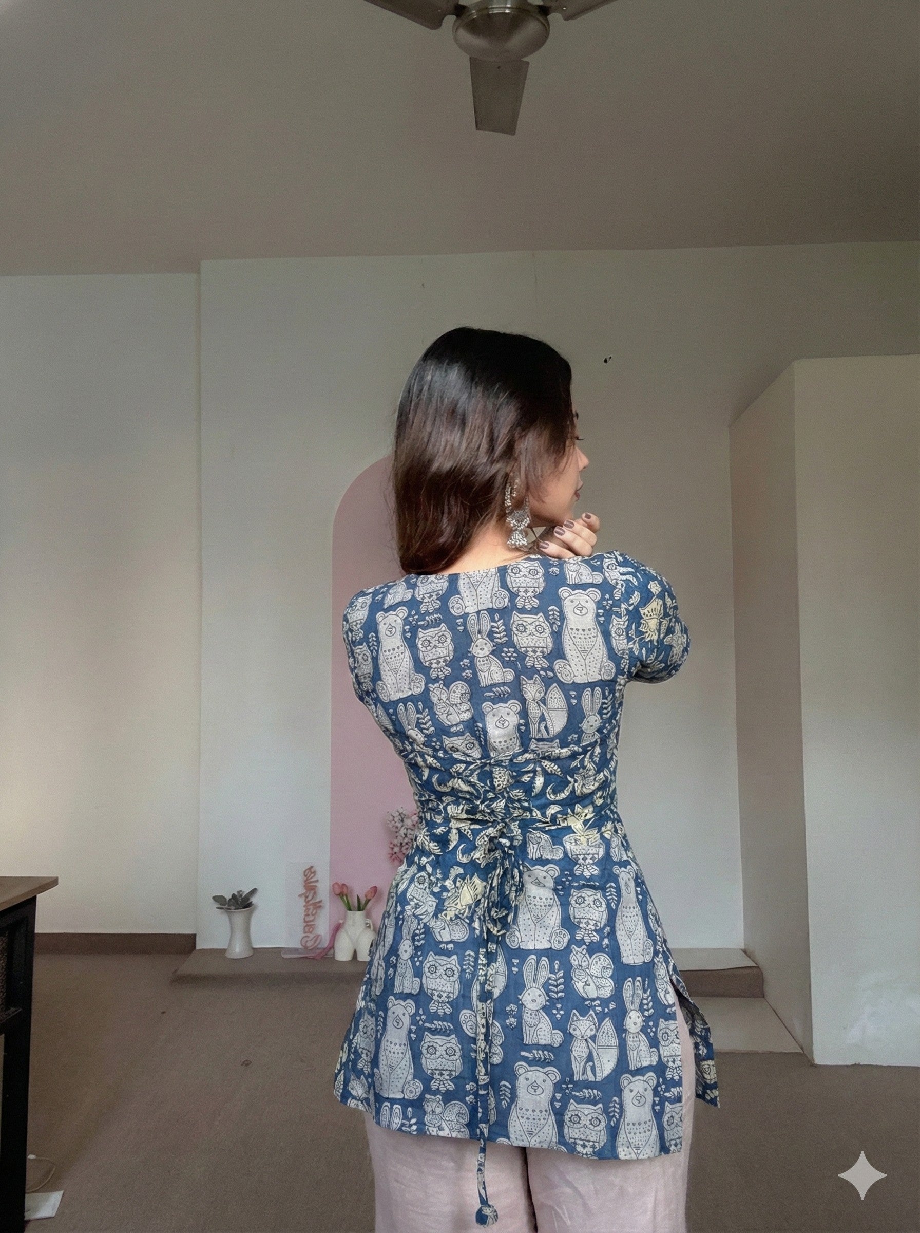 This trending style features adjustable back lace ties and a neck tie string, designed to flatter every body type from XS to 4XL. Perfect for pairing with skirts, pants, or sarees for a fusion ethnic look.