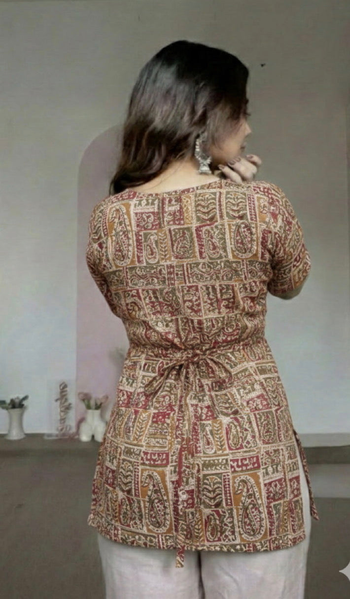 This trending style features adjustable back lace ties and a neck tie string, designed to flatter every body type from XS to 7XL. Perfect for pairing with skirts, pants, or sarees for a fusion ethnic look.